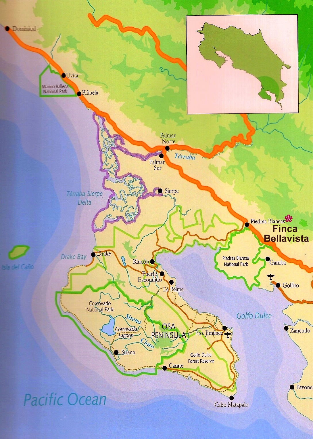 Finca Bellavista is an easy half-hour drive north from the southern port town of Golfito, the main south Pacific port in Costa Rica. Those arriving by boat will find Golfito is well equipped to accommodate most of their cruising needs. The 'fast ferry' from Golfito to Puerto Jimenez leaves Golfito at 7:30 a.m. and 2:30 p.m. and is $5 one way. The same ferry leaves Puerto Jimenez going to Golfito at 8:45 a.m. or 4:20 p.m.